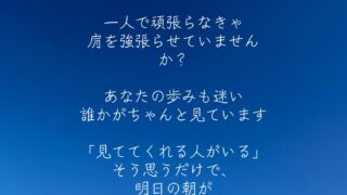 今日の前向きなれるポジ言葉🍀あなたのことを気にかけている一人で頑張らなきゃ肩を強張らせていませんか?あなたの歩みも迷い誰かがちゃんと見ています「見ててくれる人がいる」そう思うだけで、明日の朝が少しだけ軽くなりますあなたは決して一人じゃありま...