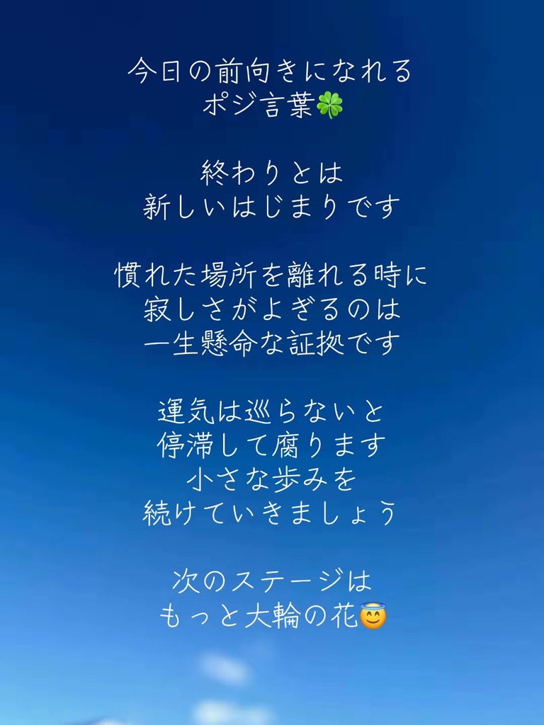 終わりとは新しいはじまりです 2026/03/30 ブログ 2026.03.30 2026/03/30 今日の前向きになれるポジ言葉🍀 終わりとは新しいはじまりです 慣れた場所を離れる時に 寂しさがよぎるのは 一生懸命な証拠です 運気は巡らないと停滞して腐ります 小さな歩みを続けていきましょう 次のステージはもっと大輪の花😇 #言葉 #人間関係 #ポジティブ #自己肯定感 #心の響く言葉 2026年3月 月 火 水 木 金 土 日 1 2345678 9101112131415 16171819202122 23242526272829 3031 « 2月 https://twitter.com/KANA9298